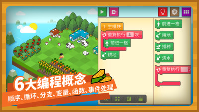 186个趣味关卡:涵盖种植、收割、植保、采摘、伐木等多种农场活动,还有可爱的小动物互动环节,让孩子乐在其中。6大编程概念:通过游戏化方式教授顺序、循环、分支、变量、函数、事件处理等核心编程概念,为后续学习打下基础。4个数学思维训练:融入空间方位、二维坐标、发现规律、凑足条件等数学思维训练,培养孩子的逻辑思维能力。6张农作物卡片:包含小麦、玉米、大豆、胡萝卜、南瓜、卷心菜等常见农作物,让孩子认识不同的植物。3种智能农机:无人机、播种机、收割机等现代化农机具,让孩子体验科技农业的魅力。另有简体、繁体两种语言版本,还包含数十个相关英文单词,帮助孩子拓展语言能力。