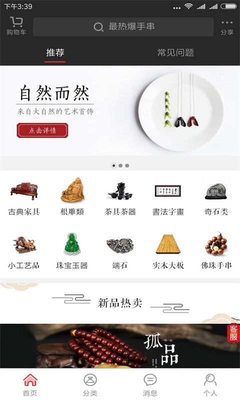 佛珠手串、竹木根雕、天然奇石、古典家具、珠宝玉器、茶叶茶器、书法字画、文玩杂项等几十种品类,上万件特有的美学孤品;每月上新超过500件独家藏品,满足不同层次收藏爱好者的需求。