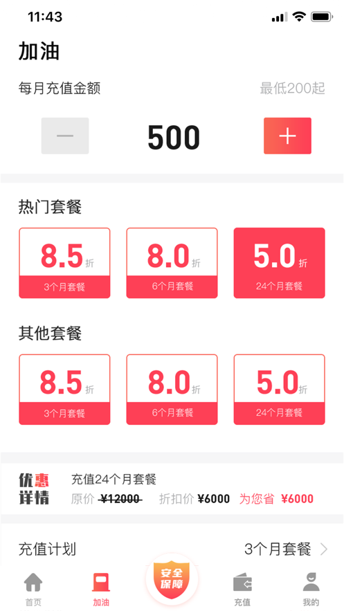 充值优惠:平台提供行业最低4.5折起的加油折扣,通过大数据分析为用户智能匹配最优方案;