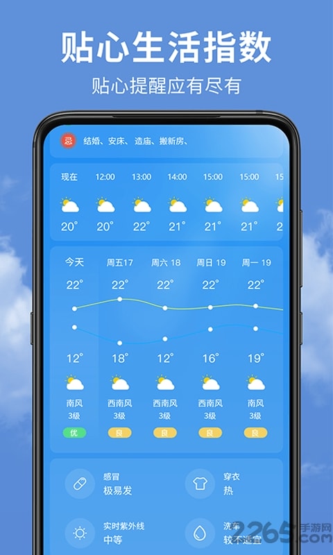 贴心提醒应有尽有,包含洗车指数、运动指数、钓鱼指数等20+专业生活指数建议;
