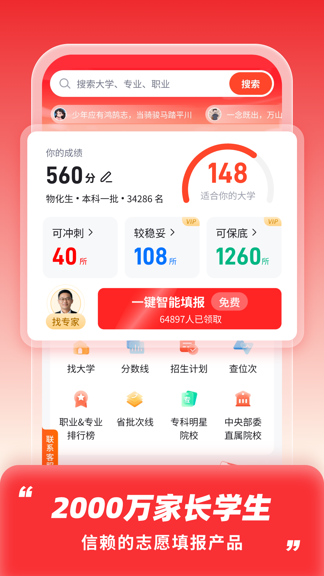 精准填报,决胜高考后一战!这是一款专为高考学子量身打造的高考志愿填报辅助软件,旨在帮助考生在高考后的关键阶段做出最明智的选择。通过智能分析和精准推荐,软件能够根据考生的分数、兴趣、职业规划等多维度数据,为其匹配最适合的院校和专业,彻底解决填报志愿时的迷茫与焦虑。