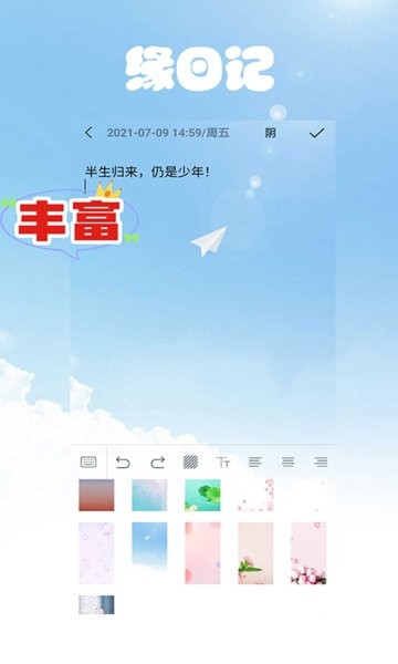 每一次记录,都是一种缘分!我们为什么写日记?是成功的坚持、生活的色彩、知识的沉淀、才华的修为;更是缘分的起点!曾经忘却的回忆四溢的才华,充满理想的现实宝钗的世,黛玉的诗,那世与诗的碰撞读懂自己,读懂他每日的故事缘于此,伴一生---缘日记。这款应用不仅是一个简单的记事本,更是连接过去与未来的时光桥梁,通过智能算法还能自动生成月度回忆报告,让用户以全新视角重温生活轨迹。