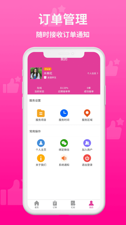 完善的订单管理系统让您对工作安排一目了然。实时接收订单通知,查看订单详情,管理服务进度,所有操作都在指尖完成,让工作更加井然有序。