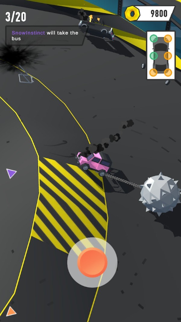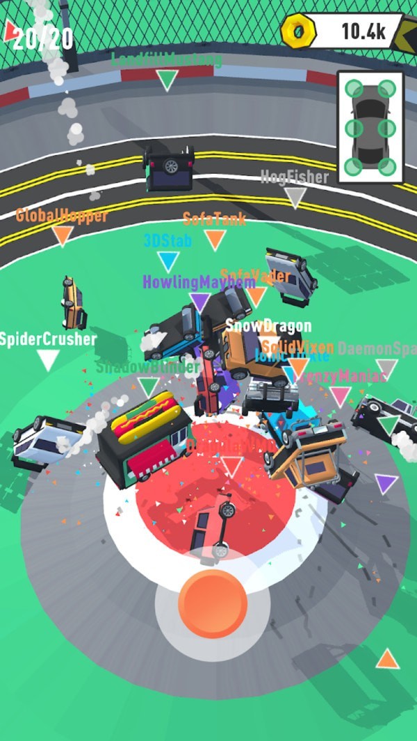 将你自己的对手全部都顺利的撞击出去,获得游戏全部的奖励。每场胜利都会解锁新的成就和称号,彰显你的战斗实力。你自己可以灵活的移动汽车位置,保证你自己的汽车可以不被敌人撞击。游戏提供多种操控模式,包括重力感应和虚拟按键,满足不同玩家的操作习惯。可以自由的掌握你自己的汽车,在蜂窝状的地图上开始撞击你自己的对手。地图会随机刷新增益道具,为战局增添更多变数和乐趣。