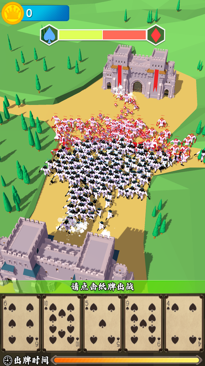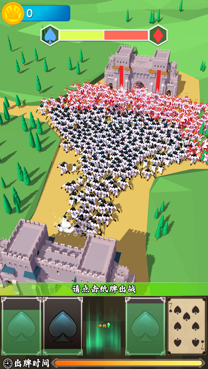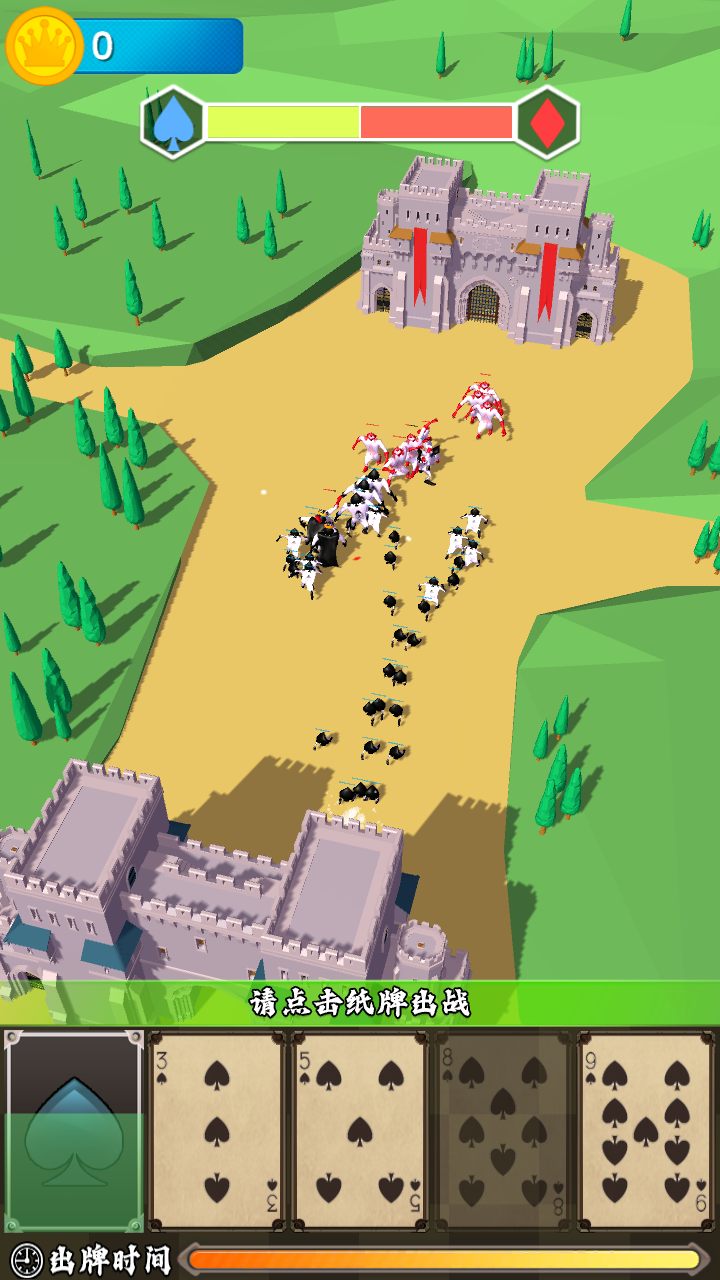 玩家通过点击卡牌将黑桃兵部署到战场,不同强度的卡牌有着相应的冷却时间。自动合成系统让相同的卡牌可以升级为更强大的单位,直到达到最大尺寸。游戏胜负取决于能否在敌方攻破己方城池前先攻陷对方城堡。多变的战场局势要求玩家时刻调整战术,体验紧张刺激的攻防对决。