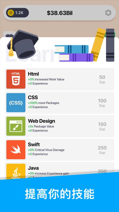 -学习所有技能并建立自己的惊人公司。丰富的技能树系统包含编程、设计、营销等多个领域,玩家可以自由组合打造独特的商业帝国。