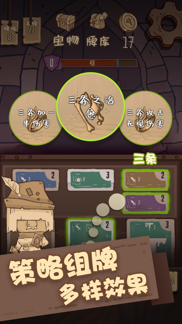 游戏操作简单直观,点击图标即可前进到相应地点,如商店或升级点。需要注意的是,一旦到达某个地点就无法返回,但如果角色尚未到达目的地,可以随时更改前进方向。战斗界面清晰明了,玩家可以随时查看敌我双方的生命值状态,以及敌人下一步的行动意图。游戏采用独特的地牌和手牌系统:上方为地牌区域,会自动更换,集齐3张相同地牌即可触发效果;下方为手牌区域,长按可查看详细信息。巧妙保留某些地牌是取胜的关键技巧。