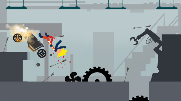 火柴人在碰到机关和武器的时候,会造成伤害,并且被摊开,如果满是机关的话,那画面..。游戏采用夸张的物理效果表现,火柴人会以各种滑稽的姿态被弹飞、压扁或炸碎,配合搞笑的音效,创造出令人忍俊不禁的喜剧效果。