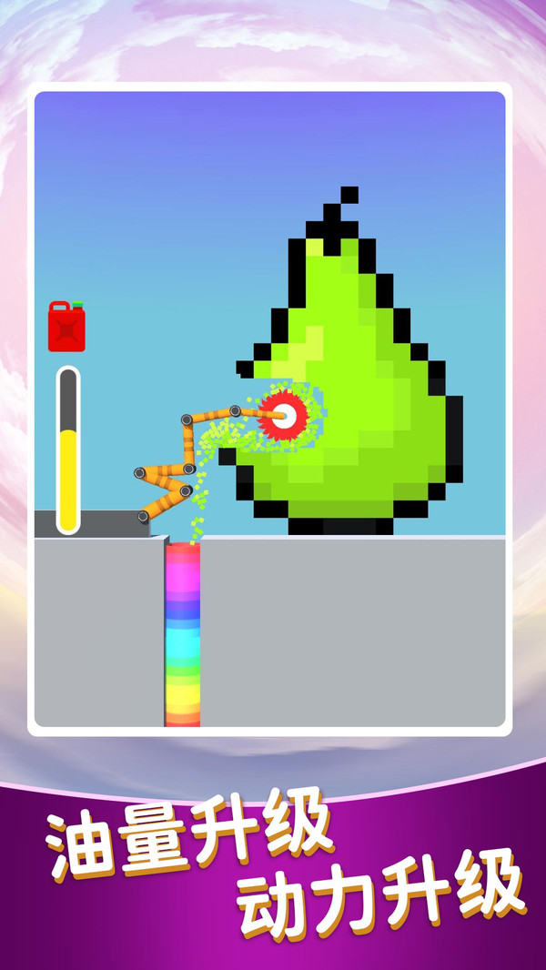 切割超人是一款充满创意与乐趣的益智休闲解压闯关游戏,玩家将扮演一名切割达人,使用各种切割工具来挑战巨型水果和蔬菜。在游戏中,每一次切割都会带来令人满足的视觉效果,果汁四溅的场景让人倍感解压。游戏界面左侧设有机器储油量显示,玩家需要在油量耗尽之前完成所有切割任务,否则挑战将宣告失败。随着关卡的推进,切割目标会变得更加复杂,考验玩家的反应速度和策略规划能力。