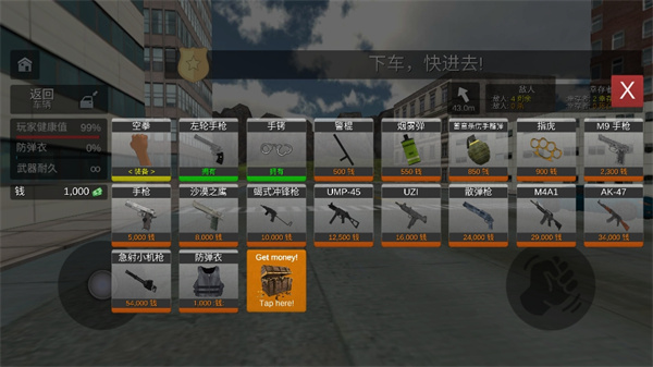 当玩家下车执行任务时,操作模式会自动切换。左侧变为角色移动控制,右侧则是攻击/射击按键。这种智能化的操作切换让游戏体验更加流畅自然。