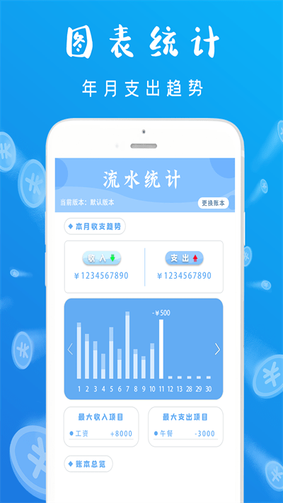 ·图表统计:提供柱状图、饼图等多种可视化图表,直观展示年月支出趋势和消费结构