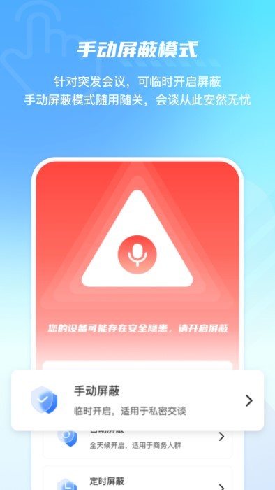 智能屏蔽:支持手动和自动两种屏蔽模式。手动模式适用于特定场合的临时防护,而自动模式则可以全天候守护您的隐私安全,智能识别并屏蔽可疑的监听行为。