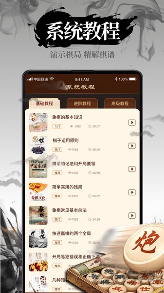系统教学体系:按照用户水平划分初级、中级、高级三个阶段,每个阶段都配备完整的课程体系,循序渐进地提升用户的象棋水平。