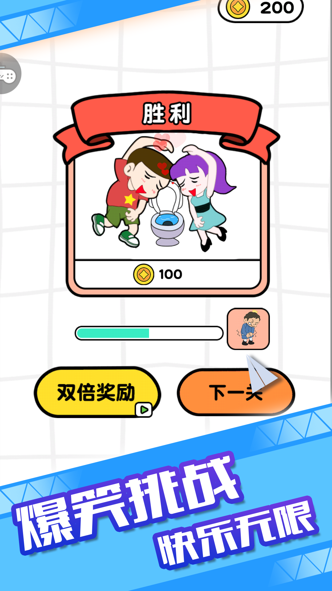 《啊啊我憋不住啦》是一款极具创意的益智解谜游戏,玩家需要为急需上厕所的角色规划最佳路线。游戏场景中充满了各种有趣的障碍:行动缓慢的老人会挡住去路,活泼好动的小朋友会在走廊上跑来跑去,甚至还有调皮的小狗突然窜出。玩家必须仔细观察每个角色的移动规律和速度差异,巧妙利用时间差和空间错位来规划路线。成功帮助角色到达厕所不仅能获得成就感,还能赚取金币奖励。游戏将日常生活场景与解谜玩法完美结合,让简单的"上厕所"变成了一场充满挑战的脑力激荡。随着关卡推进,障碍设置会越来越复杂,考验玩家的应变能力和空间想象力。