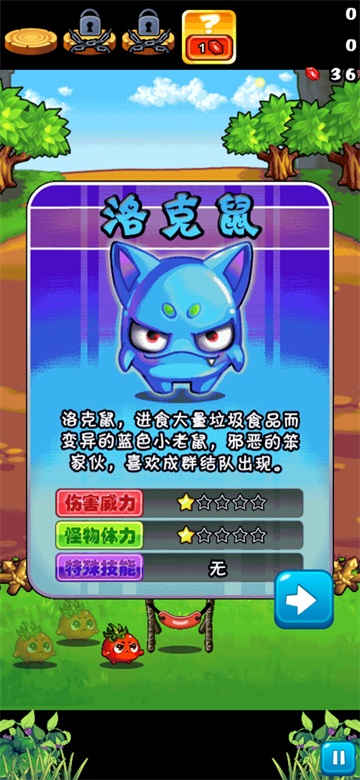 第5关:怪物战队在第4关的基础上增加了数量,依然是遵照消灭8号机器人,再消灭蜗牛的原则,选择南瓜+大蒜+土豆的组合,胜率比较高。建议将大蒜布置在靠近出口的位置,利用其减速效果延长战斗时间。第6关:战斗开局解锁怪物——猴子,生命值2星、危险系数3星,可远距离喷射毒药,一个火南瓜或一个竹子可干掉,鉴于其喷射毒药频率很高,建议选用竹子攻击。与8号机器人一样,只要关卡内出现猴子,优先攻击。此外战队中还有装甲鼠、队长鼠,盟友组合选用竹子+土豆+大蒜。注意队长鼠会强化周围怪物,务必优先击杀。