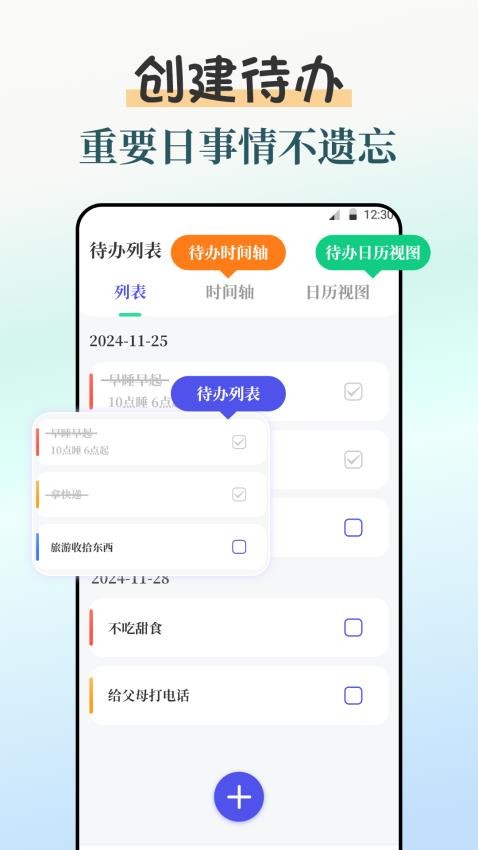 待办事项支持富文本编辑,可添加图片、录音等多媒体备注。智能识别输入内容,自动建议合适的时间和标签。