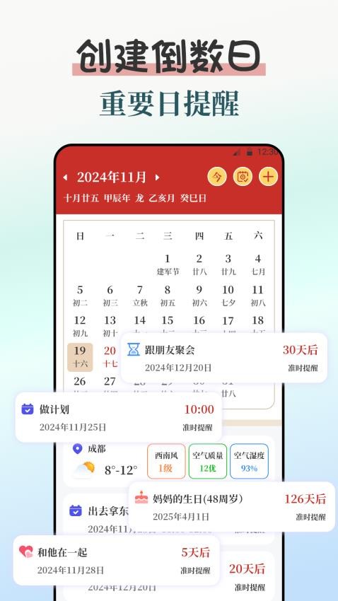 天气模块提供分钟级降水预报,出行安排更精准。日历支持农历显示,传统节日自动高亮标注。