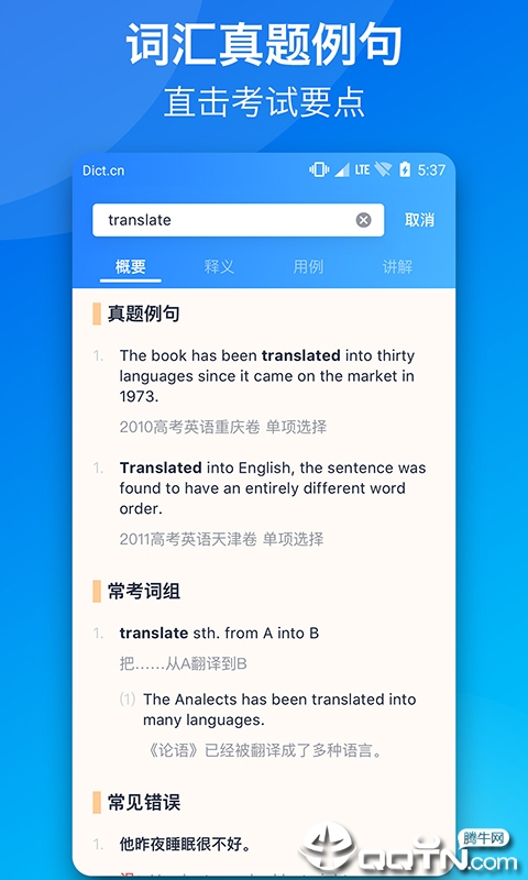 真人标准发音:所有词条均配备英美双发音示范,由专业播音员录制,发音清晰标准。