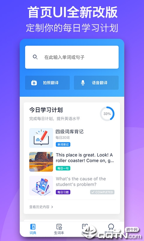 个性化词典:支持商务英语、托福雅思、考研升学、四六级考试、初高中课业等十余种学习场景的个性化设置,每种模式都配备专属的学习资源和功能模块。