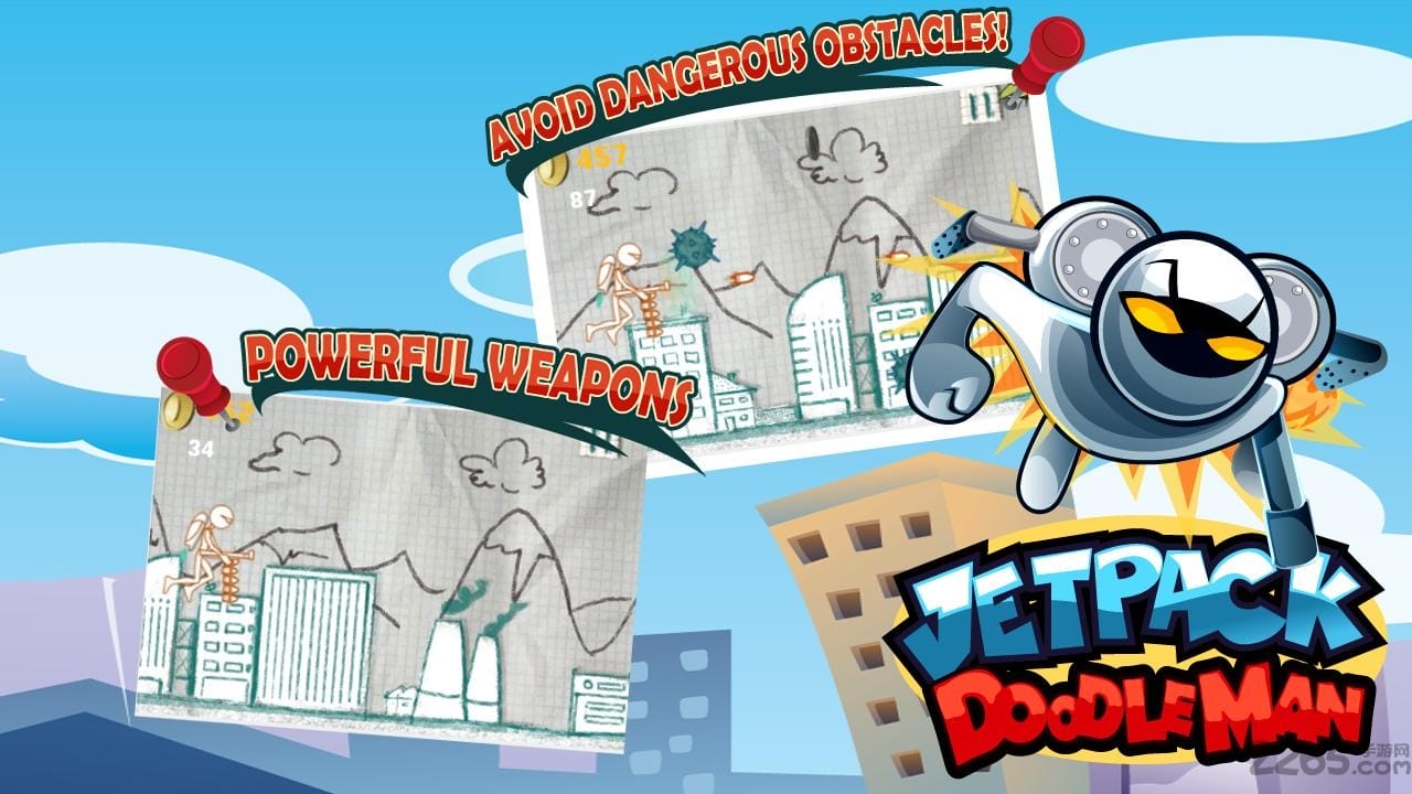 喷射背包涂鸦人(JetpackDoodleMan)是一款极具创意的涂鸦风格射击游戏。在这个充满想象力的游戏世界中,玩家将扮演一位与众不同的涂鸦英雄,使用高科技喷射背包在未来的卡通城市上空展开冒险。游戏设定在一个被变异蚊子入侵的奇幻世界,这些蚊子会形成乌云般的庞大群体向玩家发起攻击。随着游戏进程,玩家将解锁更多有趣的关卡场景,从城市上空到热带雨林,每个场景都充满独特的视觉元素和挑战。游戏还加入了丰富的剧情元素,让玩家在战斗之余也能感受到引人入胜的故事背景。