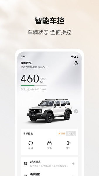 坦克车况全掌控,绑定爱车,随时关注车辆健康状况,体验互联服务或智能控车功能。支持远程启动、空调控制、车窗开关等20余项智能控制功能。