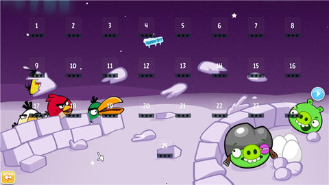 愤怒的小鸟冬季版延续了系列标志性的幽默叙事风格,讲述了一群愤怒的小鸟为了夺回被绿猪偷走的鸟蛋,不惜化身"鸟肉炮弹"攻打猪堡的故事。冬季特别版中,故事场景被白雪覆盖,绿猪们戴上了毛线帽,小鸟们也换上了应景的冬装。游戏采用明亮活泼的2D卡通画风,雪地、冰屋等场景细节处理得十分精致。当红色小鸟划破寒冷的空气砸向猪堡时,溅起的雪花和冰块破碎的效果都令人忍俊不禁。背景音乐延续了系列轻松欢快的风格,而小鸟们被弹射时发出的搞怪叫声,更是为游戏增添了不少喜剧效果,让玩家在寒冷的冬季也能感受到游戏的温暖与欢乐。