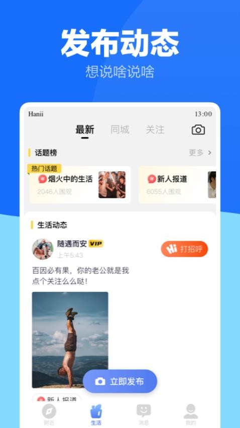 支持用户发布图文动态,分享生活点滴。发布的内容会显示在个人主页,方便好友了解你的近况。