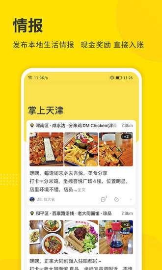 基于LBS定位技术,实时推送您周边3公里内的新鲜事。天津这么大,身边发生了哪些有趣的活动、新开了什么店铺、有什么突发事件,在这里都能第一时间知晓,让您不错过任何精彩。