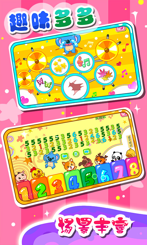 钢琴:内置88键标准钢琴音色,支持8个音符同时发声。从简单儿歌到经典名曲,孩子可以随心弹奏。钢琴界面采用彩色按键设计,帮助孩子轻松识别音阶,激发创作灵感。