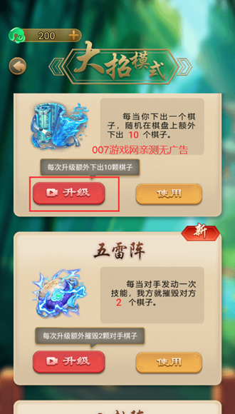 五雷阵:对手每次发动技能时,自动摧毁其x颗棋子,升级可增加摧毁数量,有效克制对手的大招。