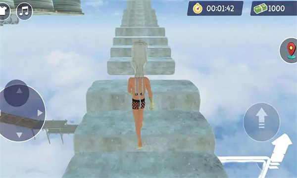 游戏中玩家可以自由地在云端漫步,寻找最佳路线。玩家需要灵活运用奔跑、攀爬和跳跃等动作来克服障碍。游戏左侧的虚拟摇杆控制角色移动方向,操作简单直观。同时要注意观察环境变化,合理规划前进路线才能获得更高分数。