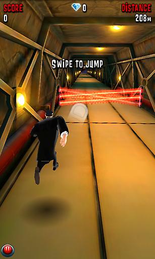 本作是一款跑酷类游戏,整体设计与神庙逃亡相似,玩家通过触屏操控特工角色进行高速奔跑和射击。游戏中,玩家将扮演一名特工,接到上级指令后需要完成一系列任务,过程中需要不断奔跑、躲避障碍并使用武器消灭敌人。游戏提供了四名特工角色供玩家选择,包括男主角特工达史、女主角特工乔安娜、男一号特工颚骨和男二号特工博巴乔布。初始角色为达史,其他角色需要通过积累钻石解锁。此外,男女主角各有三套服装可供更换,服装设计融入了阿凡达、猫女、侍应生、复古间谍等多种电影元素,让玩家在奔跑的同时也能展现个性风格。