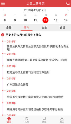 日期查询功能十分强大,例如今天是12月12日,您不仅可以查看对应名人的出生日期、生日和去世日期,还能了解当天发生的重大历史事件,让每一天都充满历史意义。