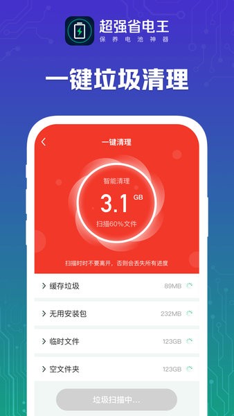 超强省电王app是一款专为安卓用户设计的智能电池管理工具,能够有效延长手机续航时间。它通过智能监测后台应用运行状态,自动关闭不必要的耗电程序,让电池使用更加高效。软件提供精准的电量预测功能,实时显示剩余使用时间,帮助用户合理安排手机使用计划。无论是日常办公还是外出旅行,都能避免电量焦虑。其简洁的界面设计和一键优化功能,让省电管理变得轻松便捷,真正实现"科技让生活更简单"的理念。