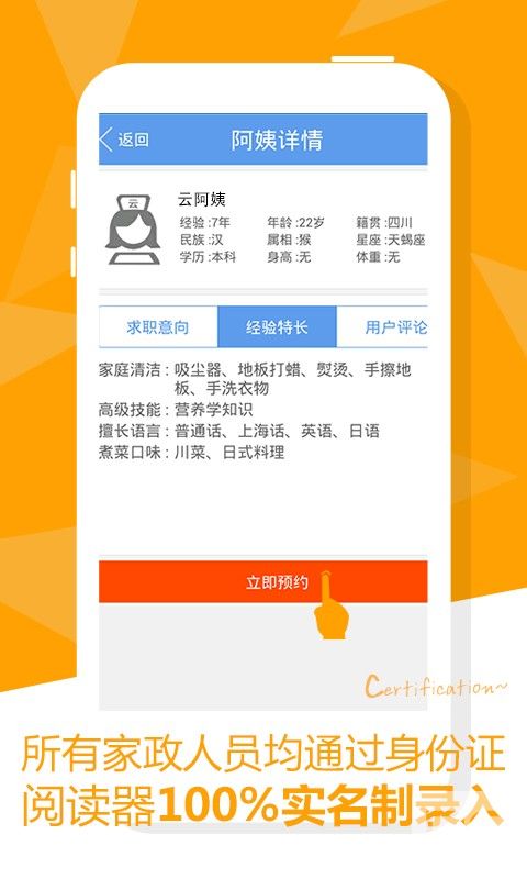 《云家政》是一款家政服务在线预订平台应用,提供给用户便捷、质量好更重要的是有诚信、有保障的家政服务。“云家政”拥有国内最大的实名认证家庭服务员数据库,致