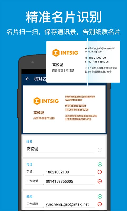 CamCard名片全能王是一款高效便捷的名片管理工具,能够通过手机相机快速拍摄名片图像,并精准识别名片上的所有联系信息。它不仅能自动判别信息类型,还能将数据按照标准联系人格式存入手机通讯录和名片中心。该软件识别率极高,对于背景不太复杂的名片,几乎可以做到全字段识别,大大提升了商务人士整理名片的效率。无论是个人还是企业用户,都能通过CamCard轻松实现纸质名片的数字化管理。