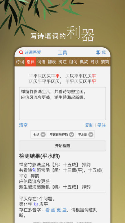 诗词吾爱提供强大的创作辅助功能,用户只需输入诗句或词语,点击"开始检测"即可进行韵律分析,系统会自动标注出押韵位置和不合格律之处。软件还具备自动注释功能,能够解析诗词中的典故出处,提供繁简体转换服务。此外,用户可以通过构词功能寻找合适的字词搭配,利用古诗检索功能查询相关诗词作品,全方位满足创作需求。