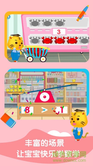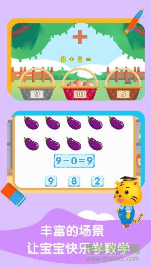 1)学数字:在温馨的教室场景中,可爱的小老虎老师会带领孩子认识数字0-9。每个数字都配有生动的动画演示和发音指导,帮助孩子建立数字与数量的对应关系。