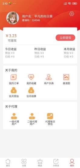 9、【个人中心】-提供收益查看、订单管理、分享赚钱等功能,让用户随时掌握账户动态和收益情况。