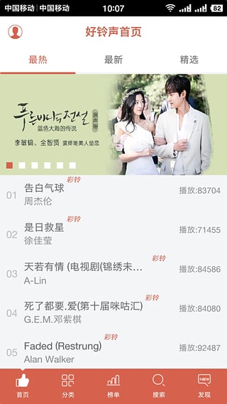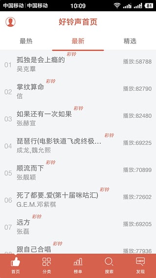 中国好铃声分类丰富多样,包含流行金曲、影视热曲、动漫游戏、短信闹铃、DJ舞曲、搞笑另类、网络神曲等。曲库超全,只要您想得到的铃声类型,在这里都能找到。每个分类下还有细分标签,帮助您快速定位心仪的铃声。