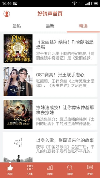 2016年火热铃声火热来袭,铃声库紧跟潮流,轻松设铃方便快捷。无论是最新流行单曲还是经典老歌,都能一键设置为手机铃声,让您的手机时刻保持新鲜感。为特别的他(她)单独设置特别的来电铃声,让每一次来电都充满惊喜与期待。