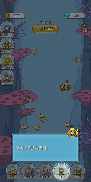 游戏的核心玩法是组建并扩大你的潜艇舰队,通过收集各种机械图纸来强化装备,最终目标是完成对深海的全面探索。这是一款非常休闲的游戏类型,操作简单易上手,适合随时随地进行游玩,能带给玩家轻松愉快的游戏体验。在驾驶潜艇深入海底的过程中,玩家需要时刻保持警惕,小心躲避游弋的鲨鱼和隐藏的水雷等危险障碍物。冒险过程中会遇到各种奇特的深海生物,有些是友善的,有些则充满敌意,需要玩家谨慎应对。游戏采用明亮活泼的卡通画风,配合生动的海底场景,为玩家营造出一个充满趣味的冒险世界。