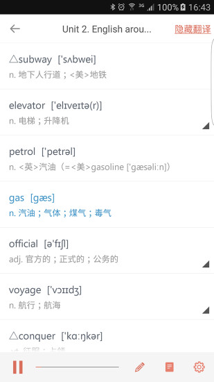 (2)教材同步词库不仅按单元分类,更创新性地将单词按"基础-提升-拓展"三级划分,每页显示5个单词的黄金记忆量。智能排版系统能根据手机型号自动优化显示效果,支持横竖屏自由切换。