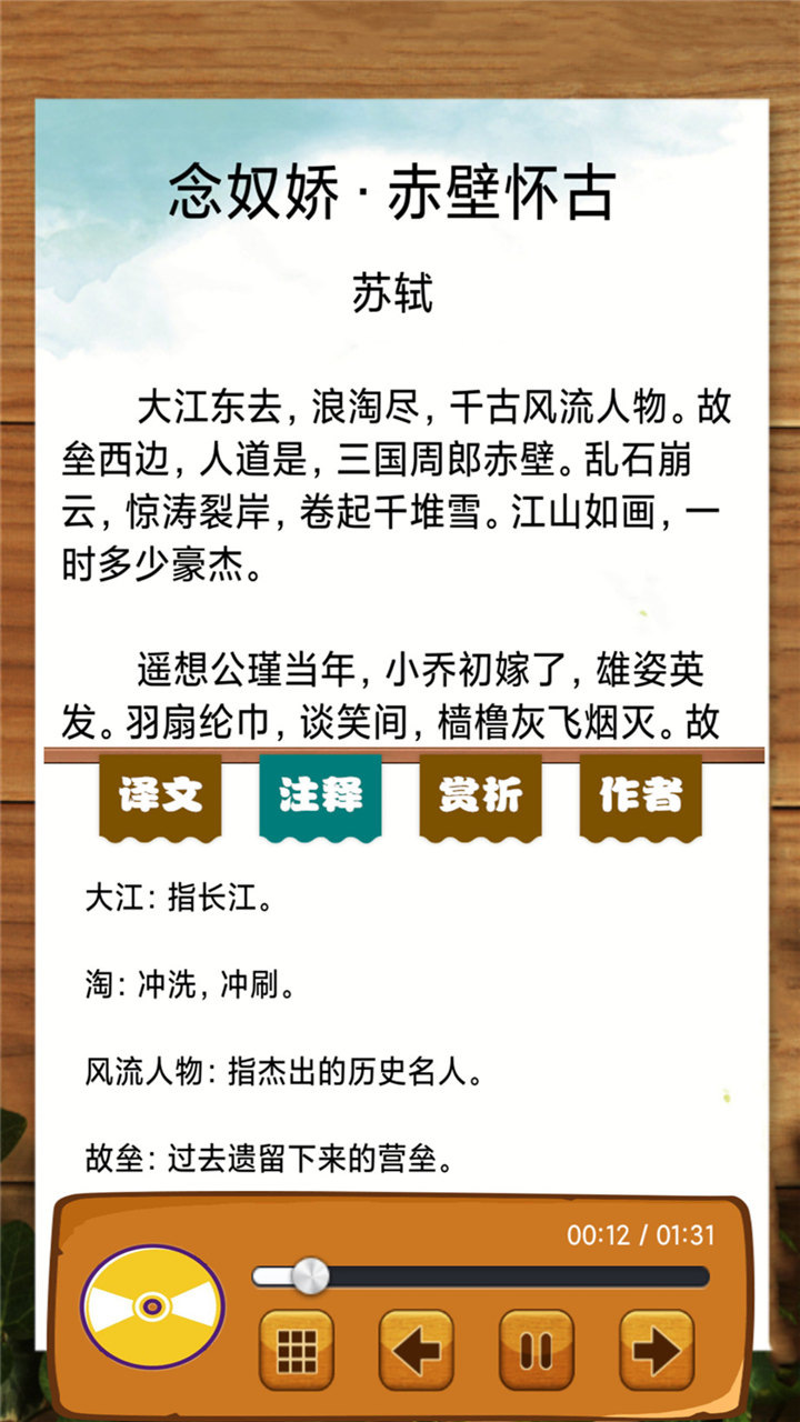 宋词三百首有声版是为学习宋词的大小朋友们开发的宋词赏析软件,宋词是继唐诗之后,我国诗歌创作的又一高峰。该软件由古典文学专家团队精心编选,涵盖苏轼、李清照、辛弃疾等两宋时期最具代表性的词人佳作。每首词作都经过权威校勘,确保文本准确性,同时配有专业播音团队录制的标准普通话朗诵音频。软件还特别设计了分级学习系统,从入门级的婉约小令到进阶的豪放长调,循序渐进地培养用户的诗词鉴赏能力。无论是中小学生还是成人爱好者,都能在这里找到适合自己的学习内容。