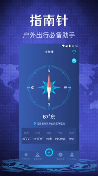 【户外指南针】支持海拔、气压、磁场强度和实况天气等专业功能,满足户外探险的多样化需求。