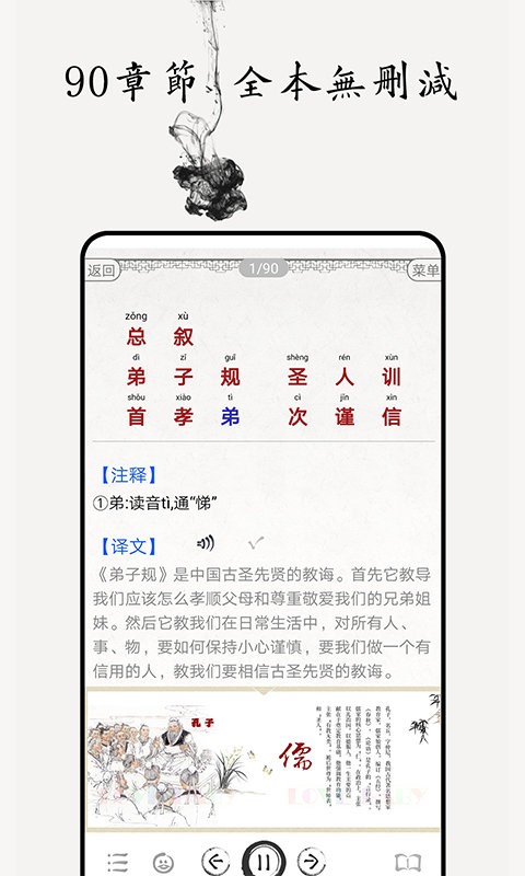 《弟子规》共有360句、1080个字,三字一句,两句一韵,和仄押韵,朗朗上口。全篇先为《总叙》,然后分为《入则孝》、《出则弟》、《谨》、《信》、《泛爱众》、《亲仁》和《余力学文》七个部分。内容大部分配备"白云"老师深情的朗诵、准确的拼音、完整的注释、甜美的译文、易懂的启示、有趣的故事、水墨风图画、还有实用/易用的录音跟读学习功能。领略国学魅力,弘扬传统文化,团队成员衷心希望国学智慧能得到家长、老师、学生的共同发扬和分享!软件研发团队历时三年打磨,邀请多位国学大师和教育专家参与内容审定,确保传统文化的准确传承。定期更新的内容库会不断增加新的学习资源和互动功能,让国学学习永葆新鲜感。