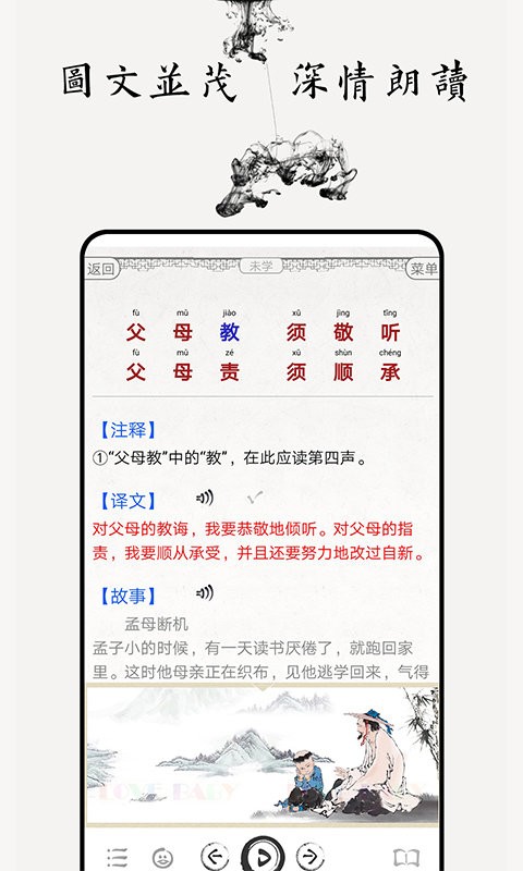 延伸典故,通过故事的讲解,能够拓展出来源以及背景,随意开启和关闭拼音。每个典故都配有原创动画短片,用孩子喜闻乐见的方式讲述传统文化故事。软件收录了上百个与《弟子规》相关的历史典故,帮助孩子建立完整的知识体系。