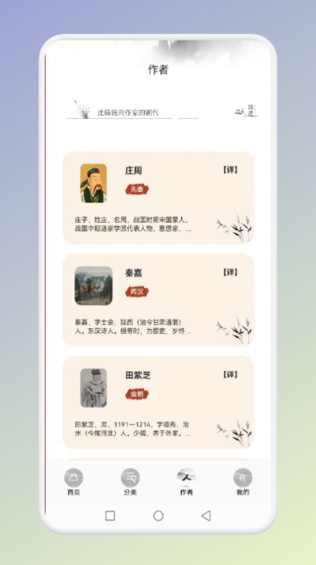 一键查找到许多古人的信息,帮助用户们更好的了解每一位诗人的背景。软件内置了庞大的诗人数据库,不仅包含诗人的生平事迹、创作风格等基本信息,还特别整理了诗人之间的交往故事和创作轶事。通过时间轴和关系图谱的展示方式,让用户直观了解唐代诗坛的发展脉络和诗人间的互动关系。