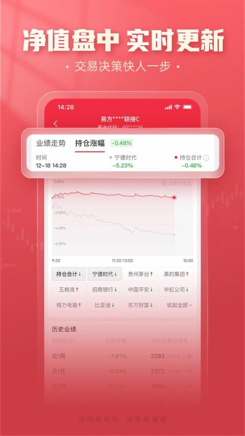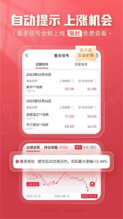 2、用户可以随时在软件上查看各样的基金上涨、下跌提示;这些提示会以醒目的方式显示在首页,用户也可以设置个性化提醒,确保不会错过重要信息。