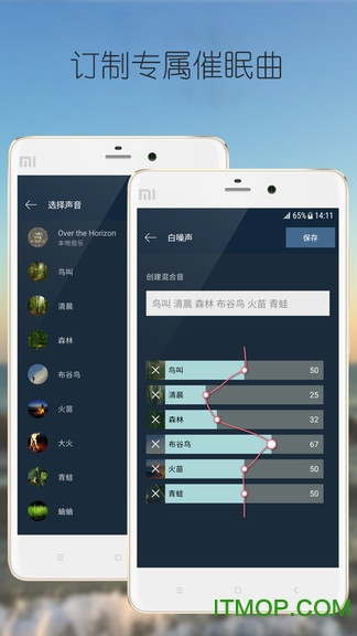 您可以自定义您喜爱的声音,通过混合最多九种默认背景音频在一个中,以此创造无限个性化的放松音效及睡眠音乐,更多无限可能的组合待你来挖掘。专业调音师预设的20种经典组合方案,满足不同场景需求。